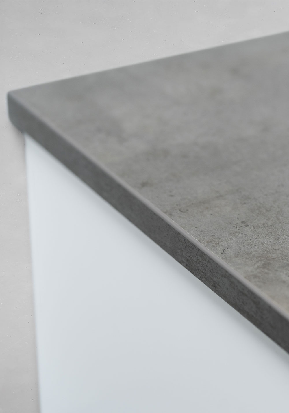 Cement-patterned melamine-coated, MDF countertop Holes are made by the installer according to the mixer, freestanding washbasin model and position chosen.