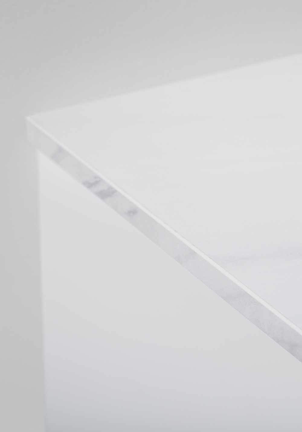 Marble-patterned countertop made of melamine-coated MDF. Punching is performed by the installer depending on the choice of placement of the mixer and the freestanding sink.